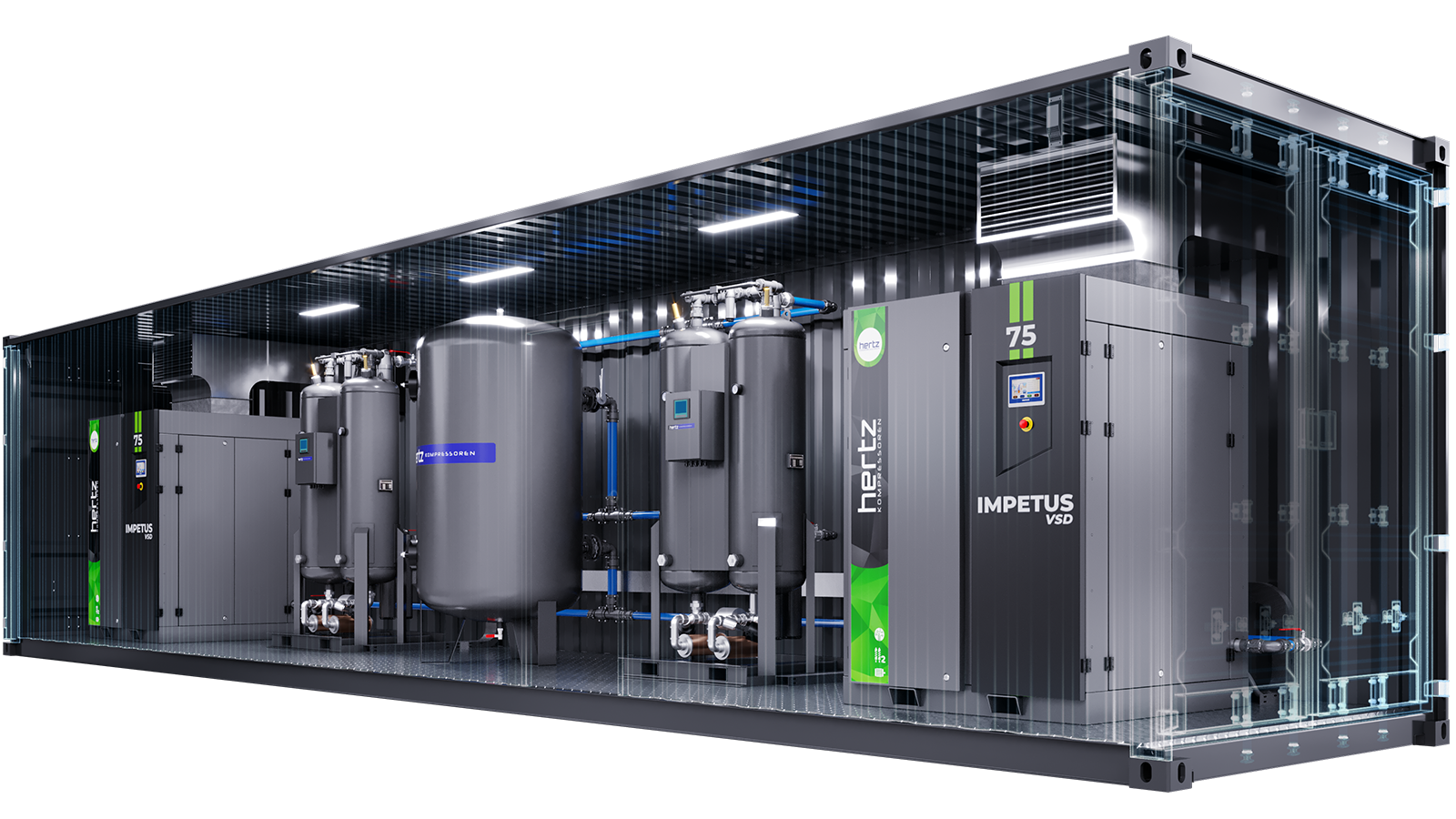 Hertz Kompressoren offers containerized solutions in 10, 20, and 40-foot options to meet the needs of businesses of all sizes. The systems are designed to operate safely within a temperature range of 0–45°C and can optionally be adapted for extreme conditions from –50°C to +50°C. High-quality compressors, filters, dryers, and wet/dry air tanks are fully integrated within the container, providing a compact and complete compressed air solution.