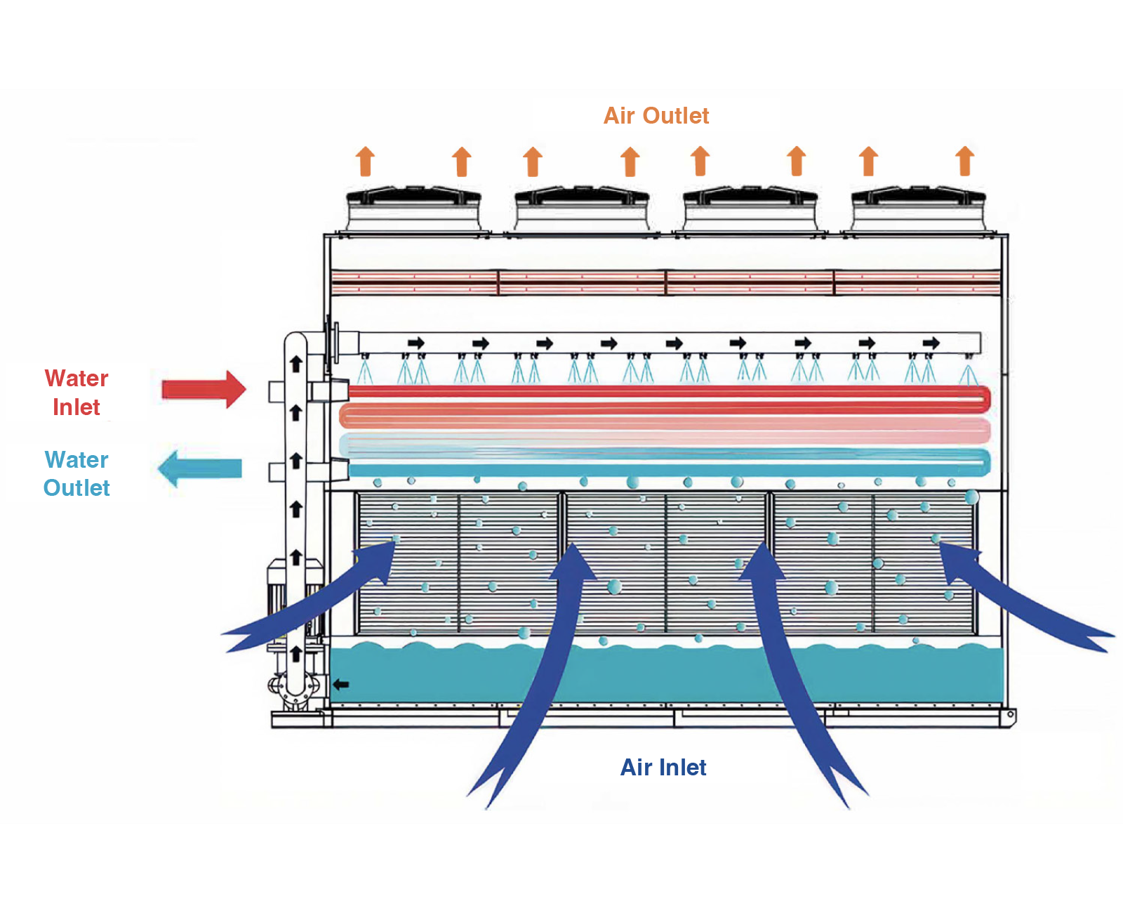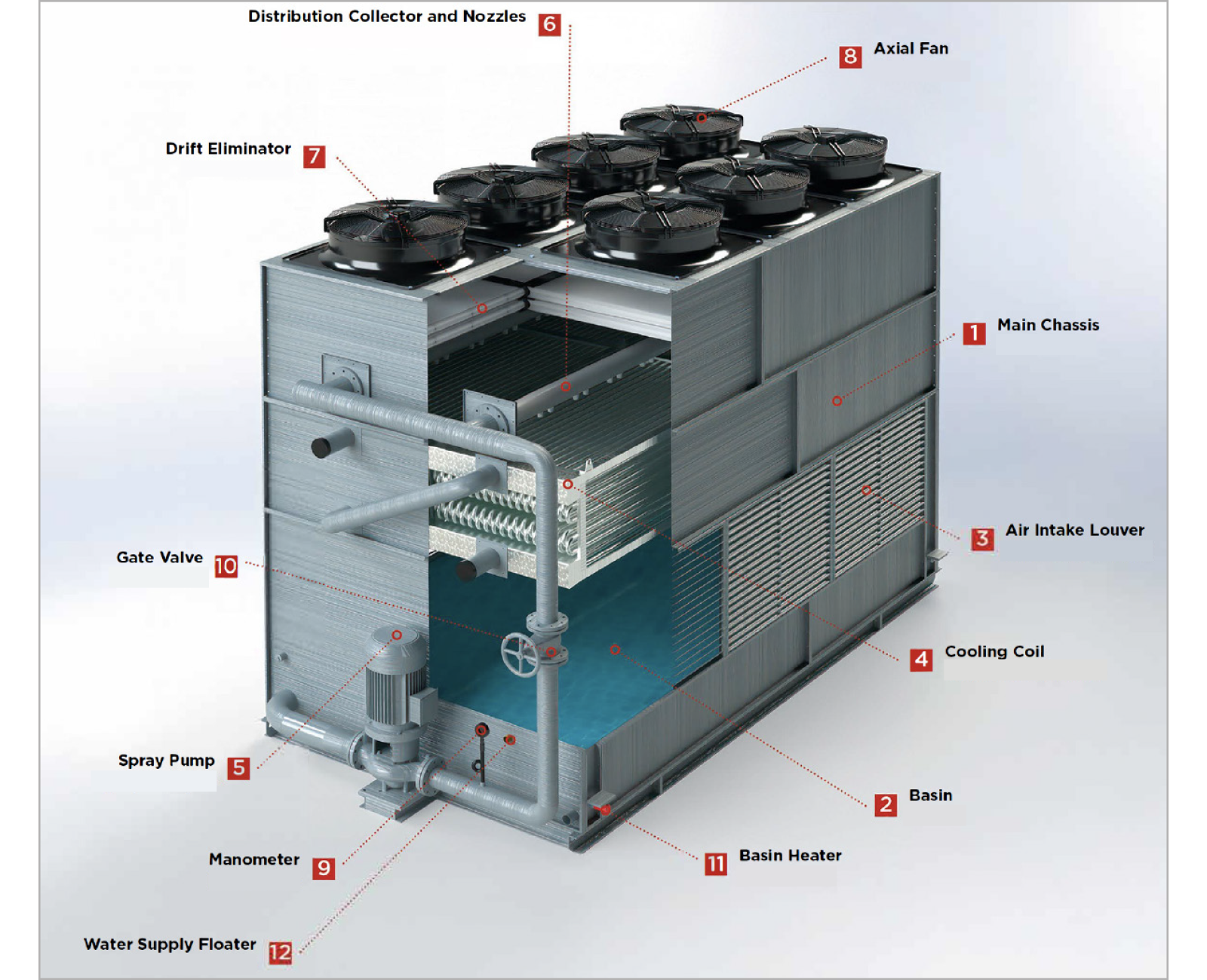 • Drift eliminator: Minimises water loss and is an important